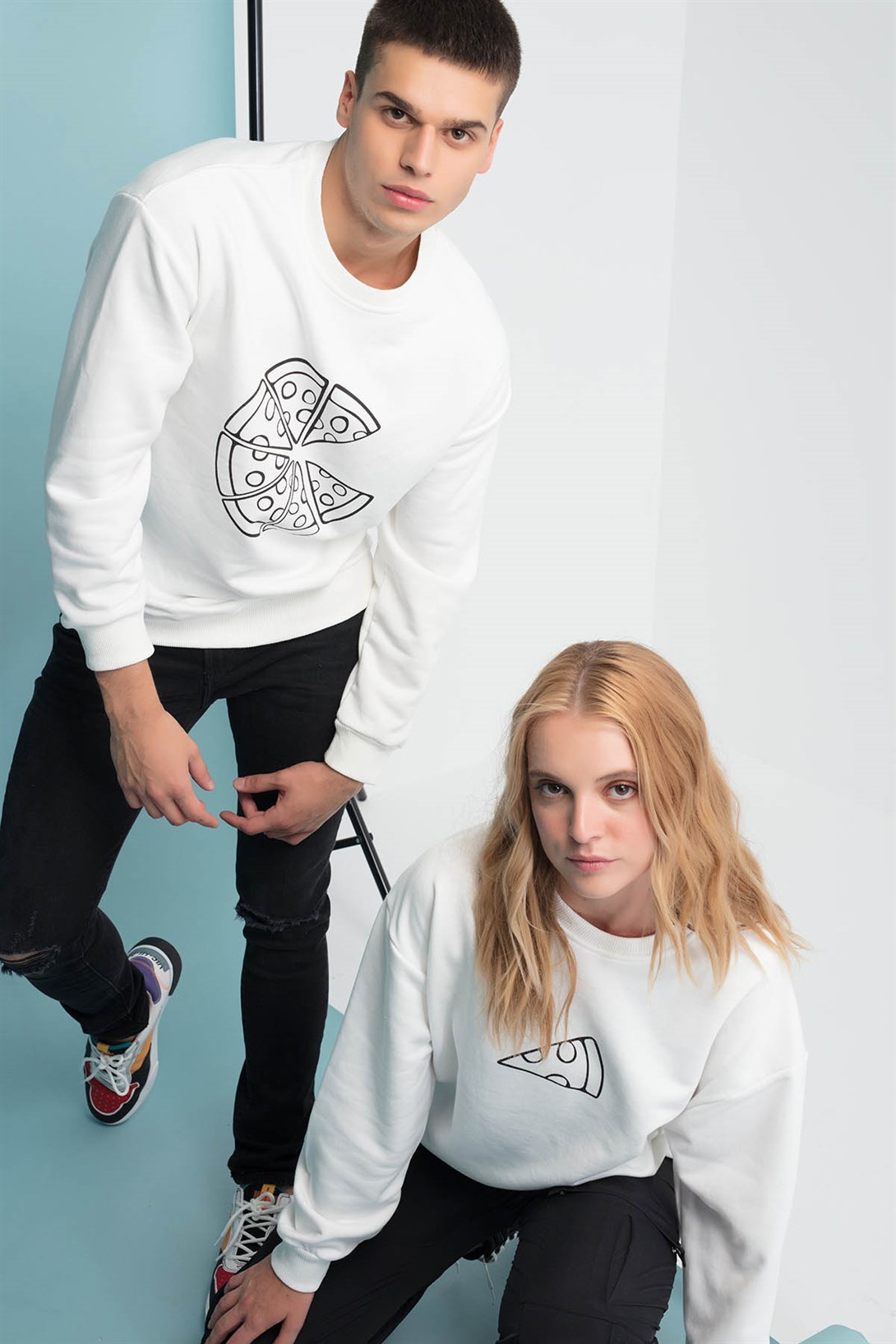 Pizza Couple Yuvarlak Yaka Sweatshirt Beyaz %100 Pamuk
