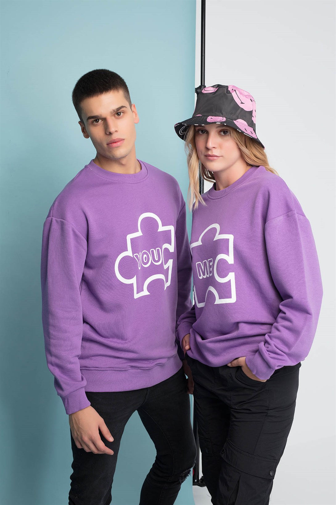 Puzzle Couple Yuvarlak Yaka Sweatshirt Mor %100 Pamuk